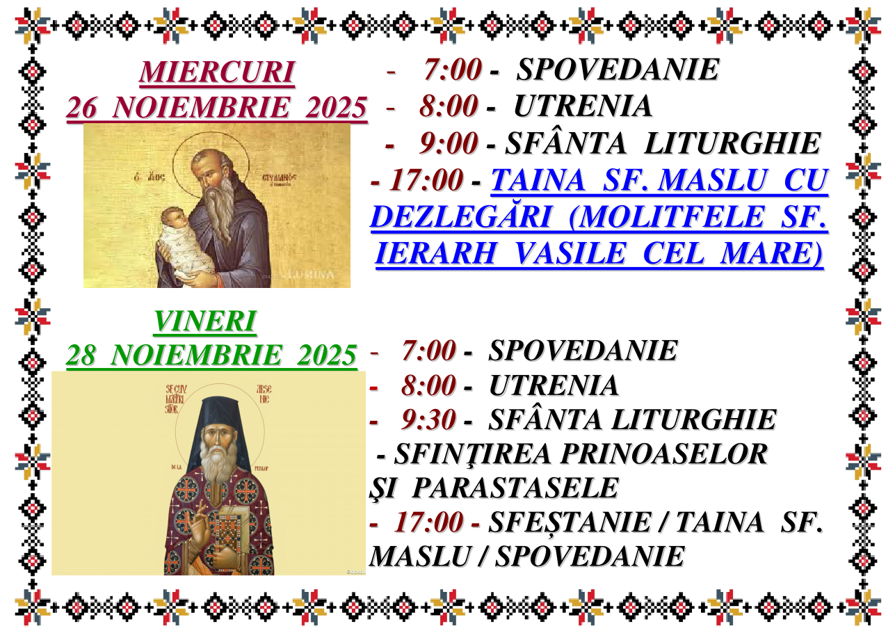 Programul Sfintelor Slujbe din Postul Naşterii Domnului