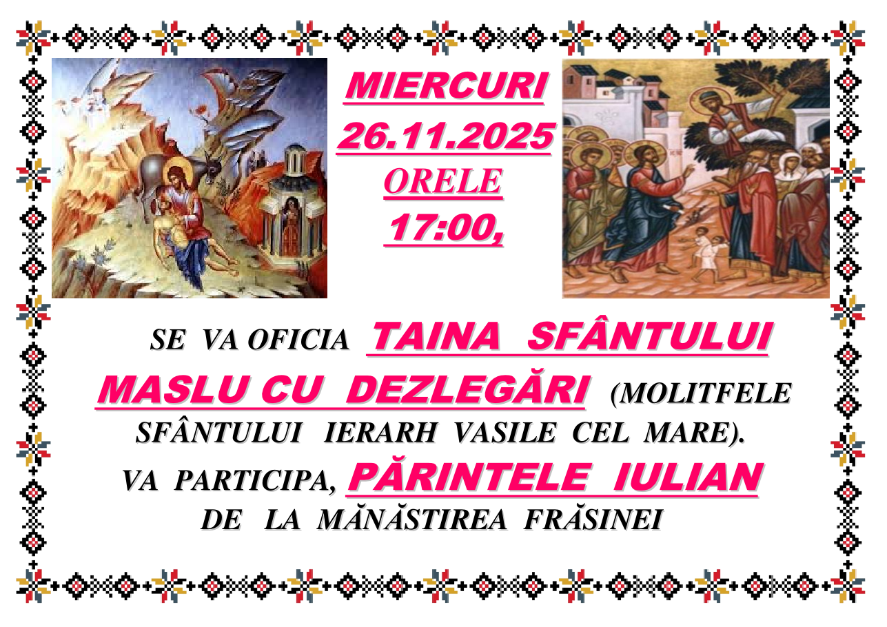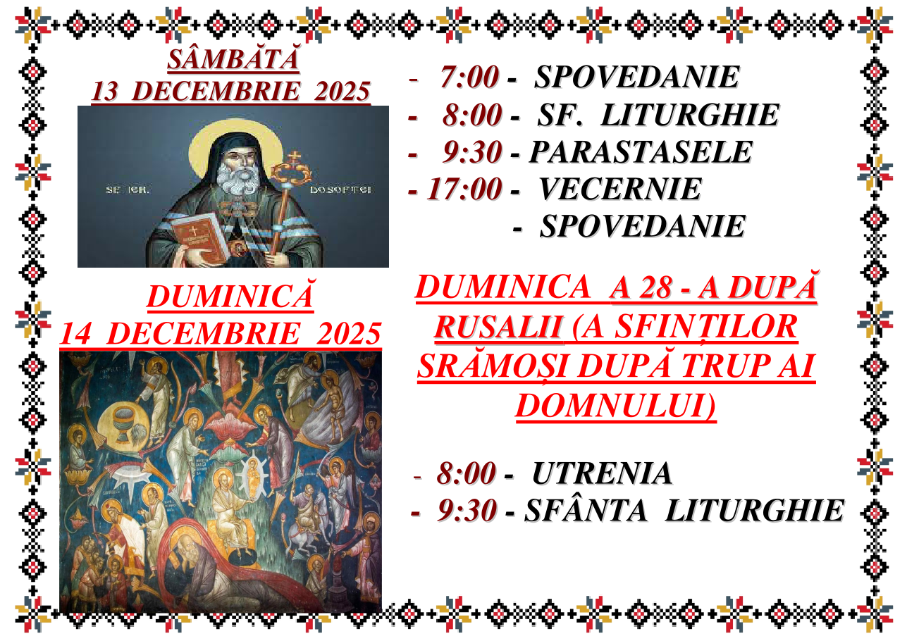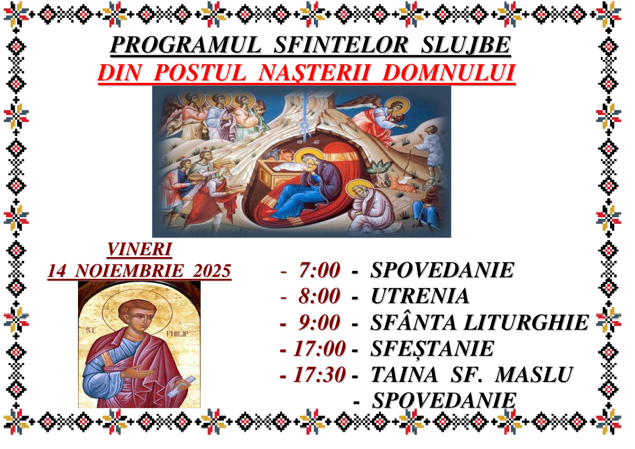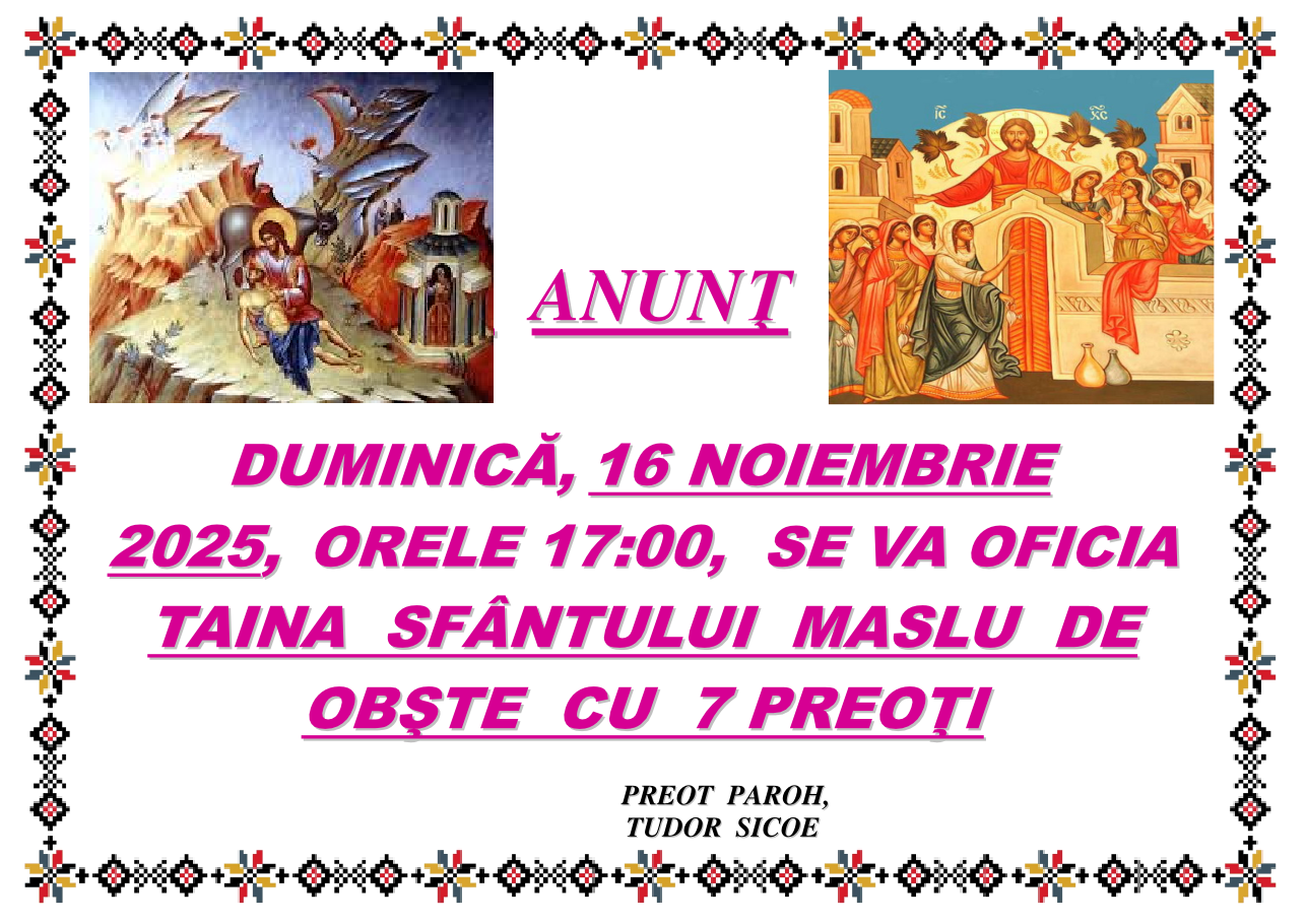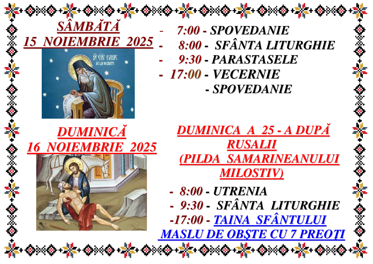 Astăzi, Joi, 13 Noiembrie, 2025 †) Sf. Ier. Ioan Gură de Aur, arhiepiscopul Constantinopolului, și mama sa, Sf. Antu- za (Lăsatul secului pentru Postul Nașterii Domnului) 1 Tesaloniceni 2 9 Voi vă aduceți aminte, fraților, de munca și de osteneala noastră: lucrând zi și noapte, ca să nu-i fim povară cuiva dintre voi, așa v’am propovăduit Evanghelia lui Dumnezeu. 10 Voi sunteți martori, și Dumne- zeu, cu câtă sfințenie și cu câtă dreptate și cu câtă neprihănire ne-am purtat între voi, cei cre- dincioși. 11 După cum știți, ca un părinte pe copiii săi, pe fiecare din voi v’am îndemnat și v’am încurajat și v’am îndatorat 12 să umblați în chip vrednic de Dumnezeu Care vă cheamă în îm- părăția Sa și’n slava Sa. 13 De aceea și noi ne’ncetat Îi mulțumim lui Dumnezeu că voi, primind cuvântul lui Dumnezeu pe care l-ați auzit de la noi, nu ca pe un cuvânt al oamenilor l-ați primit, ci potrivit cu ceea ce este el într’adevăr, ca pe un cuvânt al lui Dumnezeu, care și lucrează întru voi, cei ce credeți. 14 Că voi, fraților, v’ați făcut ur- mători Bisericilor lui Dumnezeu care sunt în Iudeea întru Hristos Iisus, fiindcă și voi ați îndurat de la cei de un neam cu voi aceleași [suferințe] ca și ele de la Iudei, Luca 11 14 Și a scos un demon, și acela era mut. Și a fost că atunci când a ieșit demonul, mutul a vorbit și mulțimile s’au minunat. 15 Iar unii dintre ei au zis: „Cu Beelzebul, căpetenia demonilor, scoate demoni”. 16 Iar alții, ispitindu-L , Îi cereau semn din cer. 1 17 Dar El, cunoscând gândurile lor, le-a zis: „Orice împărăție care se dezbină în sinea ei se pustiește și casă peste casă cade. Cu intenția de a-L pune la încercare.1 18 Dacă deci Satana s’a dezbinat în sinea lui, cum îi va mai dăinui împărăția? Fiindcă voi ziceți că Eu cu Beelzebul îi scot pe demoni. 19 Iar dacă Eu îi scot pe demoni cu Beelzebul, fiii voștri cu cine îi scot? De aceea ei vă vor fi judecători. 20 Dar dacă Eu îi scot pe demoni cu degetul lui Dumnezeu , iată că împărăția lui Dumnezeu a ajuns la voi! 2 21 Atunci când un om tare, înarmat fiind, își păzește curtea, avuțiile lui sunt în pace; 22 iar când unul mai tare decât el vine asupră-i și-l înfrânge, acela îi ia toate armele în care se încrezuse și-și împarte prăzile. 23 Cel ce nu este cu Mine e împo- triva Mea; și cel ce nu adună cu Mine, risipește.3 În locul paralel de la Mt 12, 28: cu Duhul lui Dumnezeu. Expresia „degetul lui Dumnezeu” este preluată din Iș 8, 19 și se referă la puterea lui Dumnezeu care lucra prin Moise împotriva puterilor magice ale vrăjitorilor egipteni. 2 Sfânta Scriptură versiune diortosită după Septuaginta, redactată și adnotată de Mitropolit Bartolomeu Valeriu Ana- nia 3 Tâlcuire „Când cel tare și înarmat își păzește curtea, avuțiile lui sunt în pace; dar când unul mai ta- re vine asupra lui și-l înfrânge, îi ia toate armele pe care se bizuia, iar prăzile de la el le împarte.” Această pildă lămurește felul în care Domnul strică stăpâ- nirea demonică asupra sufletelor. Câtă vreme sufletul se află în pă- cat, îl stăpânește duhul rău, chiar dacă nu vădește întotdeauna acest lucru. El este mai puternic decât sufletul, drept care nici nu se teme că acesta se va răscula; îl stăpânește și îl tiranisește fără să întâmpine vreo împotrivire. Atunci însă când Domnul intră în suflet, atras de credință și pocăință, strică toate legăturile satanicești, alungă de- monul și îl lipsește de orice putere asupra acelui suflet; și atâta vre- me cât sufletul slujește Domnului, demonii nu pot să pună stăpâni- re pe el, căci este puternic prin Domnul, mai puternic decât ei. Atunci când sufletul păcătuiește și se abate de la Domnul, demonul năvălește iar și i se face sărma- nului suflet mai rău decât înainte. Aceasta este obșteasca rânduială nevăzută a întâmplărilor din lumea duhovnicească. Dacă ni s-ar des- chide ochii minții, am vedea cum duhurile rele se luptă cu sufletele în întreaga lume: biruința înclină ba de o parte, ba de cealaltă, după cum sufletele au părtășie cu Dumnezeu prin credință, pocăință și râvnă pentru fapte bune, sau se depărtează de El prin nepăsare, trândăvie și răcire față de bine.4 Sfântul Teofan Zăvorâtul, Tâlcuiri din Sfânta Scriptură pentru fiecare zi din an. 4