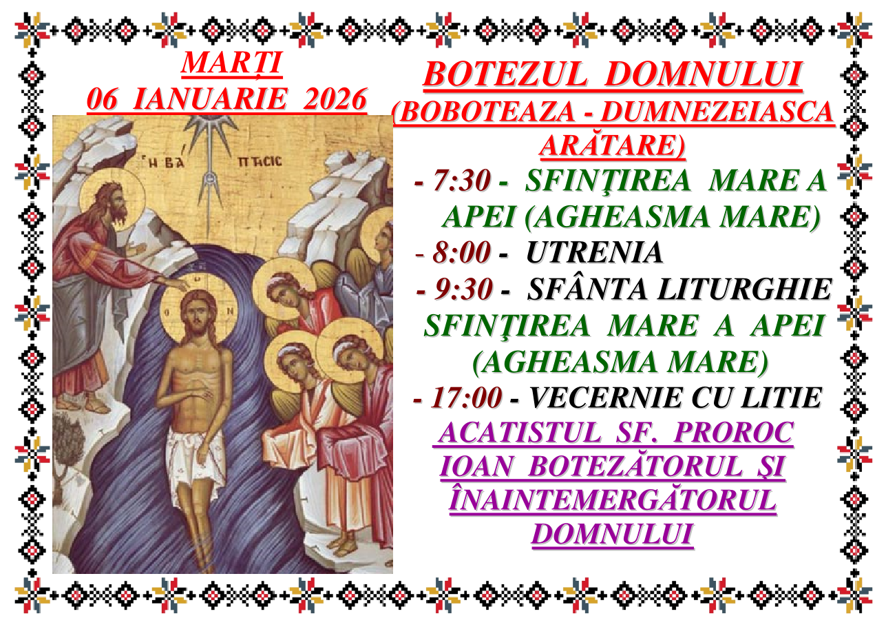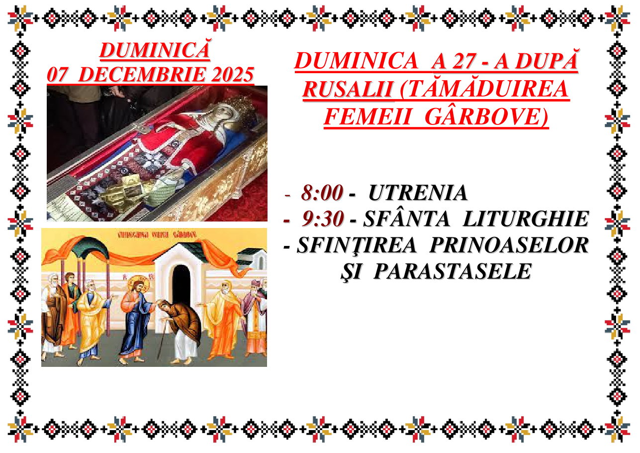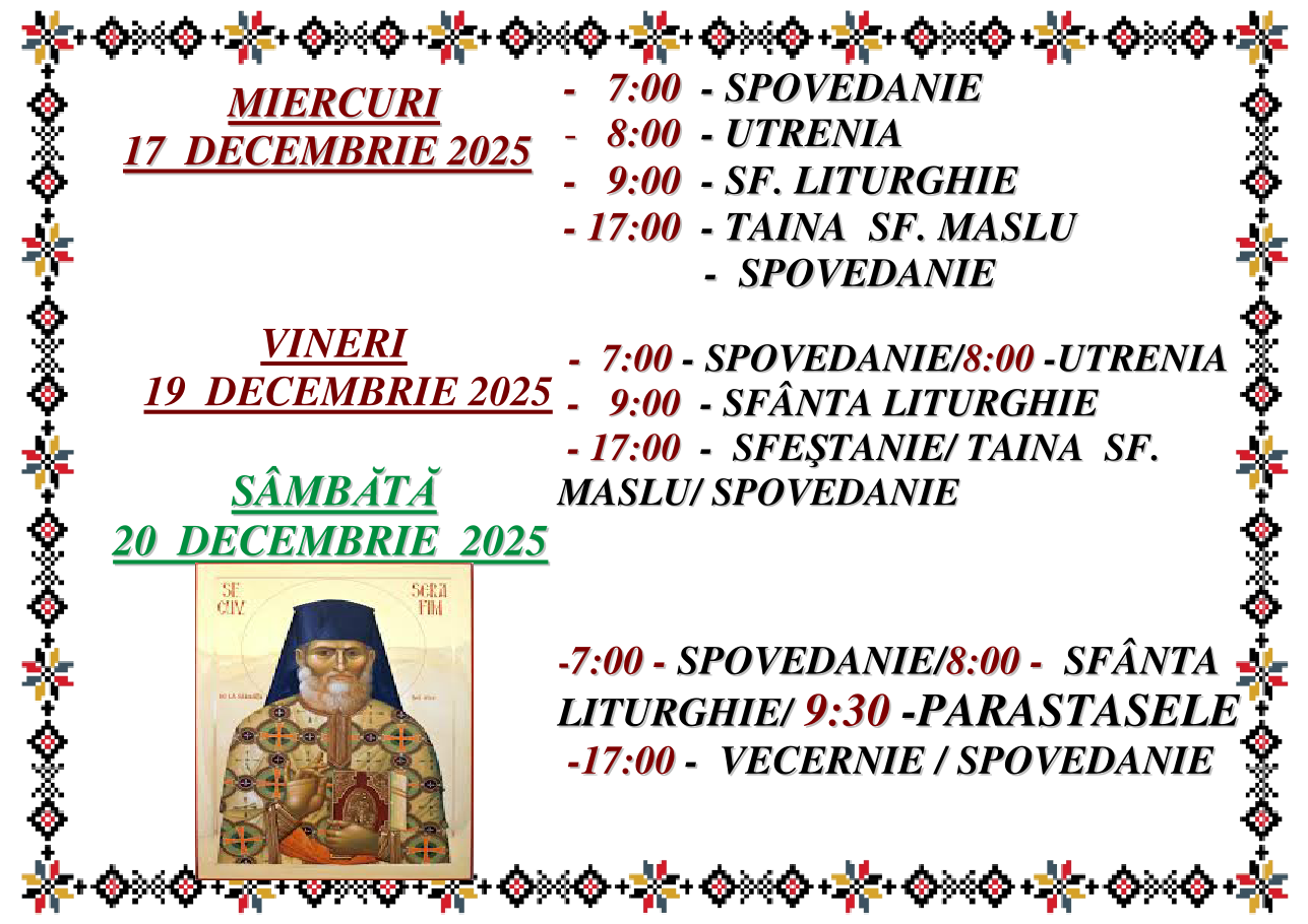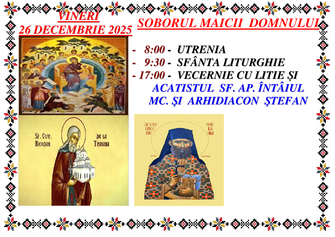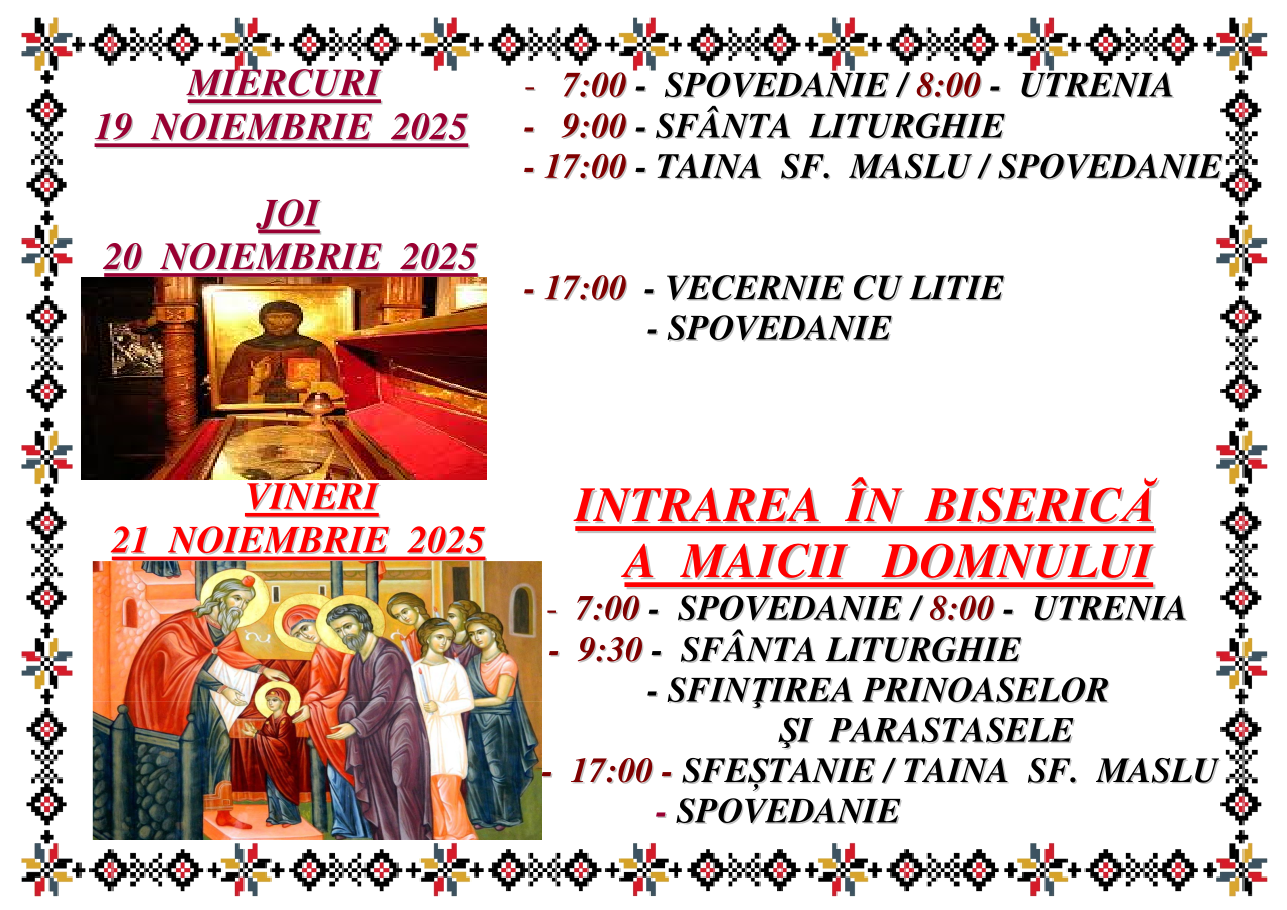 Astăzi, Joi, 13 Noiembrie, 2025 †) Sf. Ier. Ioan Gură de Aur, arhiepiscopul Constantinopolului, și mama sa, Sf. Antu- za (Lăsatul secului pentru Postul Nașterii Domnului) 1 Tesaloniceni 2 9 Voi vă aduceți aminte, fraților, de munca și de osteneala noastră: lucrând zi și noapte, ca să nu-i fim povară cuiva dintre voi, așa v’am propovăduit Evanghelia lui Dumnezeu. 10 Voi sunteți martori, și Dumne- zeu, cu câtă sfințenie și cu câtă dreptate și cu câtă neprihănire ne-am purtat între voi, cei cre- dincioși. 11 După cum știți, ca un părinte pe copiii săi, pe fiecare din voi v’am îndemnat și v’am încurajat și v’am îndatorat 12 să umblați în chip vrednic de Dumnezeu Care vă cheamă în îm- părăția Sa și’n slava Sa. 13 De aceea și noi ne’ncetat Îi mulțumim lui Dumnezeu că voi, primind cuvântul lui Dumnezeu pe care l-ați auzit de la noi, nu ca pe un cuvânt al oamenilor l-ați primit, ci potrivit cu ceea ce este el într’adevăr, ca pe un cuvânt al lui Dumnezeu, care și lucrează întru voi, cei ce credeți. 14 Că voi, fraților, v’ați făcut ur- mători Bisericilor lui Dumnezeu care sunt în Iudeea întru Hristos Iisus, fiindcă și voi ați îndurat de la cei de un neam cu voi aceleași [suferințe] ca și ele de la Iudei, Luca 11 14 Și a scos un demon, și acela era mut. Și a fost că atunci când a ieșit demonul, mutul a vorbit și mulțimile s’au minunat. 15 Iar unii dintre ei au zis: „Cu Beelzebul, căpetenia demonilor, scoate demoni”. 16 Iar alții, ispitindu-L , Îi cereau semn din cer. 1 17 Dar El, cunoscând gândurile lor, le-a zis: „Orice împărăție care se dezbină în sinea ei se pustiește și casă peste casă cade. Cu intenția de a-L pune la încercare.1 18 Dacă deci Satana s’a dezbinat în sinea lui, cum îi va mai dăinui împărăția? Fiindcă voi ziceți că Eu cu Beelzebul îi scot pe demoni. 19 Iar dacă Eu îi scot pe demoni cu Beelzebul, fiii voștri cu cine îi scot? De aceea ei vă vor fi judecători. 20 Dar dacă Eu îi scot pe demoni cu degetul lui Dumnezeu , iată că împărăția lui Dumnezeu a ajuns la voi! 2 21 Atunci când un om tare, înarmat fiind, își păzește curtea, avuțiile lui sunt în pace; 22 iar când unul mai tare decât el vine asupră-i și-l înfrânge, acela îi ia toate armele în care se încrezuse și-și împarte prăzile. 23 Cel ce nu este cu Mine e împo- triva Mea; și cel ce nu adună cu Mine, risipește.3 În locul paralel de la Mt 12, 28: cu Duhul lui Dumnezeu. Expresia „degetul lui Dumnezeu” este preluată din Iș 8, 19 și se referă la puterea lui Dumnezeu care lucra prin Moise împotriva puterilor magice ale vrăjitorilor egipteni. 2 Sfânta Scriptură versiune diortosită după Septuaginta, redactată și adnotată de Mitropolit Bartolomeu Valeriu Ana- nia 3 Tâlcuire „Când cel tare și înarmat își păzește curtea, avuțiile lui sunt în pace; dar când unul mai ta- re vine asupra lui și-l înfrânge, îi ia toate armele pe care se bizuia, iar prăzile de la el le împarte.” Această pildă lămurește felul în care Domnul strică stăpâ- nirea demonică asupra sufletelor. Câtă vreme sufletul se află în pă- cat, îl stăpânește duhul rău, chiar dacă nu vădește întotdeauna acest lucru. El este mai puternic decât sufletul, drept care nici nu se teme că acesta se va răscula; îl stăpânește și îl tiranisește fără să întâmpine vreo împotrivire. Atunci însă când Domnul intră în suflet, atras de credință și pocăință, strică toate legăturile satanicești, alungă de- monul și îl lipsește de orice putere asupra acelui suflet; și atâta vre- me cât sufletul slujește Domnului, demonii nu pot să pună stăpâni- re pe el, căci este puternic prin Domnul, mai puternic decât ei. Atunci când sufletul păcătuiește și se abate de la Domnul, demonul năvălește iar și i se face sărma- nului suflet mai rău decât înainte. Aceasta este obșteasca rânduială nevăzută a întâmplărilor din lumea duhovnicească. Dacă ni s-ar des- chide ochii minții, am vedea cum duhurile rele se luptă cu sufletele în întreaga lume: biruința înclină ba de o parte, ba de cealaltă, după cum sufletele au părtășie cu Dumnezeu prin credință, pocăință și râvnă pentru fapte bune, sau se depărtează de El prin nepăsare, trândăvie și răcire față de bine.4 Sfântul Teofan Zăvorâtul, Tâlcuiri din Sfânta Scriptură pentru fiecare zi din an. 4
