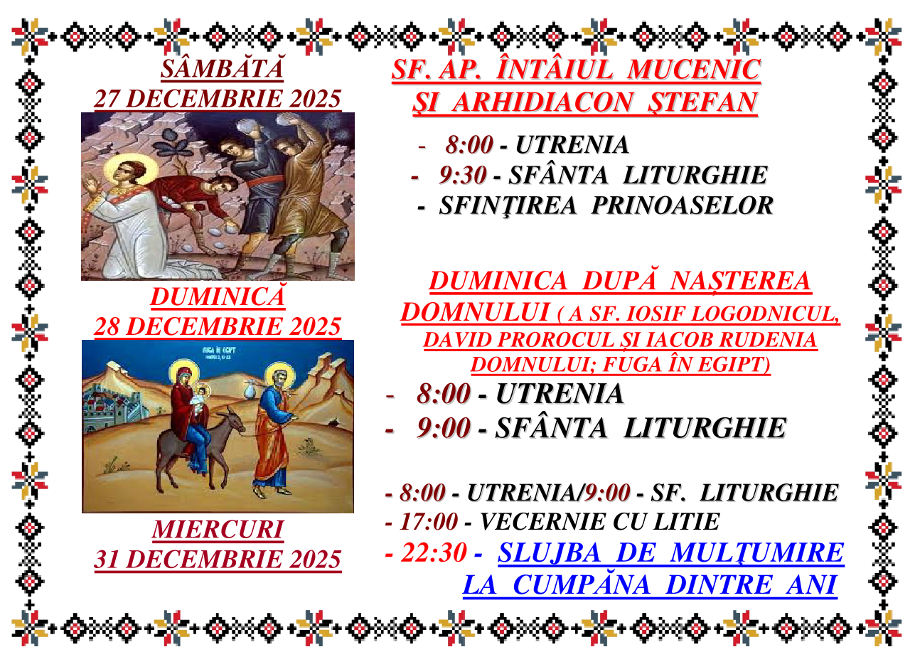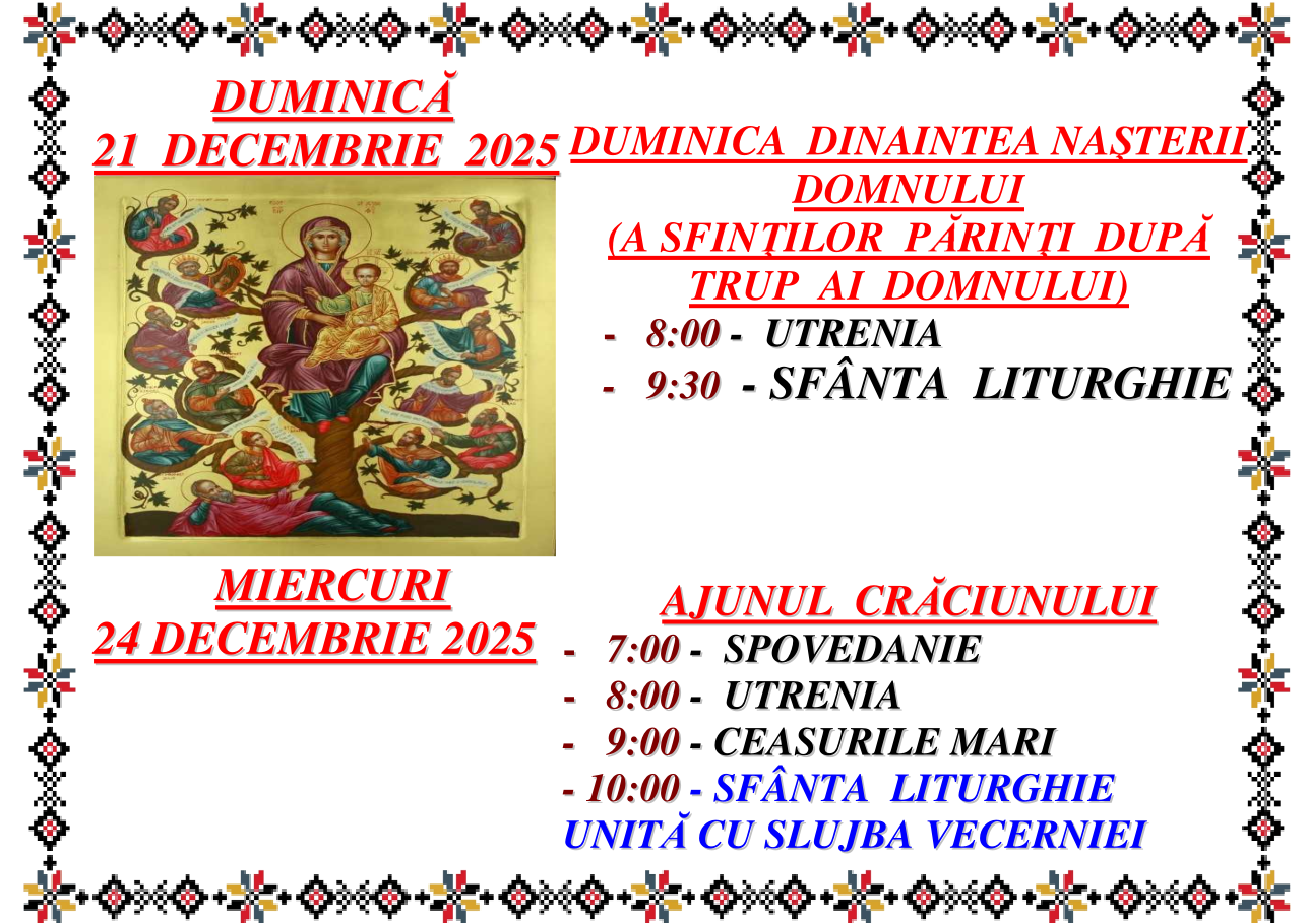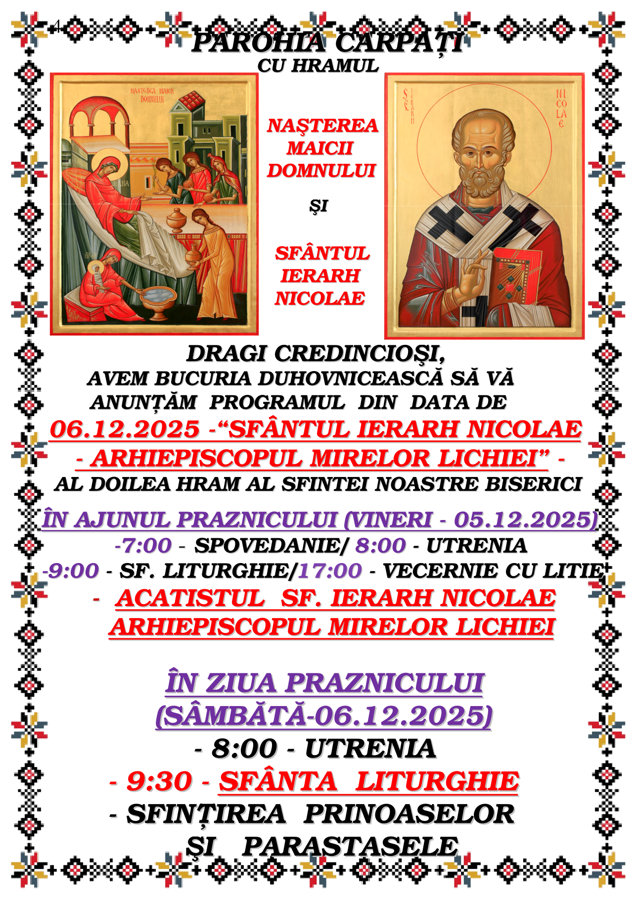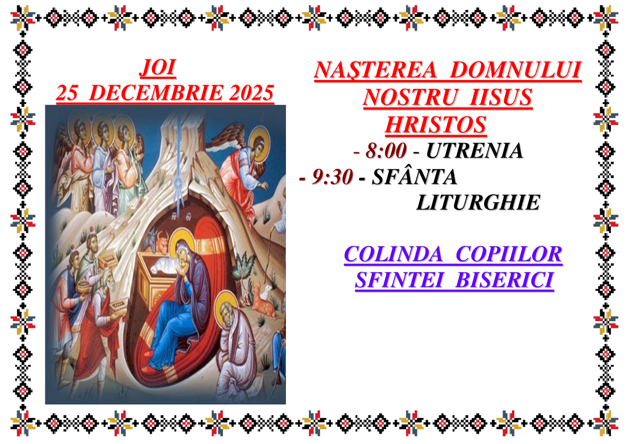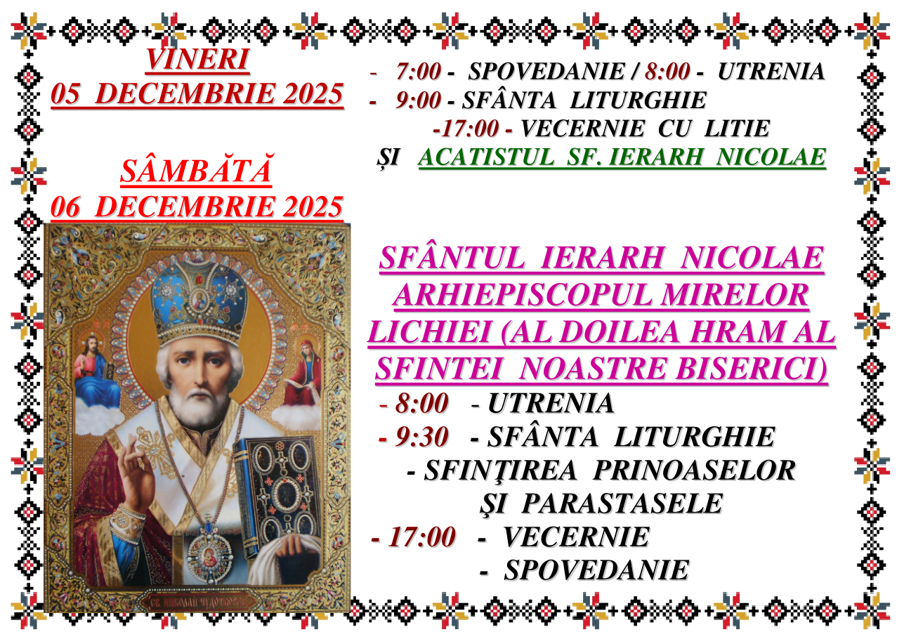 Astăzi, Joi, 13 Noiembrie, 2025 †) Sf. Ier. Ioan Gură de Aur, arhiepiscopul Constantinopolului, și mama sa, Sf. Antu- za (Lăsatul secului pentru Postul Nașterii Domnului) 1 Tesaloniceni 2 9 Voi vă aduceți aminte, fraților, de munca și de osteneala noastră: lucrând zi și noapte, ca să nu-i fim povară cuiva dintre voi, așa v’am propovăduit Evanghelia lui Dumnezeu. 10 Voi sunteți martori, și Dumne- zeu, cu câtă sfințenie și cu câtă dreptate și cu câtă neprihănire ne-am purtat între voi, cei cre- dincioși. 11 După cum știți, ca un părinte pe copiii săi, pe fiecare din voi v’am îndemnat și v’am încurajat și v’am îndatorat 12 să umblați în chip vrednic de Dumnezeu Care vă cheamă în îm- părăția Sa și’n slava Sa. 13 De aceea și noi ne’ncetat Îi mulțumim lui Dumnezeu că voi, primind cuvântul lui Dumnezeu pe care l-ați auzit de la noi, nu ca pe un cuvânt al oamenilor l-ați primit, ci potrivit cu ceea ce este el într’adevăr, ca pe un cuvânt al lui Dumnezeu, care și lucrează întru voi, cei ce credeți. 14 Că voi, fraților, v’ați făcut ur- mători Bisericilor lui Dumnezeu care sunt în Iudeea întru Hristos Iisus, fiindcă și voi ați îndurat de la cei de un neam cu voi aceleași [suferințe] ca și ele de la Iudei, Luca 11 14 Și a scos un demon, și acela era mut. Și a fost că atunci când a ieșit demonul, mutul a vorbit și mulțimile s’au minunat. 15 Iar unii dintre ei au zis: „Cu Beelzebul, căpetenia demonilor, scoate demoni”. 16 Iar alții, ispitindu-L , Îi cereau semn din cer. 1 17 Dar El, cunoscând gândurile lor, le-a zis: „Orice împărăție care se dezbină în sinea ei se pustiește și casă peste casă cade. Cu intenția de a-L pune la încercare.1 18 Dacă deci Satana s’a dezbinat în sinea lui, cum îi va mai dăinui împărăția? Fiindcă voi ziceți că Eu cu Beelzebul îi scot pe demoni. 19 Iar dacă Eu îi scot pe demoni cu Beelzebul, fiii voștri cu cine îi scot? De aceea ei vă vor fi judecători. 20 Dar dacă Eu îi scot pe demoni cu degetul lui Dumnezeu , iată că împărăția lui Dumnezeu a ajuns la voi! 2 21 Atunci când un om tare, înarmat fiind, își păzește curtea, avuțiile lui sunt în pace; 22 iar când unul mai tare decât el vine asupră-i și-l înfrânge, acela îi ia toate armele în care se încrezuse și-și împarte prăzile. 23 Cel ce nu este cu Mine e împo- triva Mea; și cel ce nu adună cu Mine, risipește.3 În locul paralel de la Mt 12, 28: cu Duhul lui Dumnezeu. Expresia „degetul lui Dumnezeu” este preluată din Iș 8, 19 și se referă la puterea lui Dumnezeu care lucra prin Moise împotriva puterilor magice ale vrăjitorilor egipteni. 2 Sfânta Scriptură versiune diortosită după Septuaginta, redactată și adnotată de Mitropolit Bartolomeu Valeriu Ana- nia 3 Tâlcuire „Când cel tare și înarmat își păzește curtea, avuțiile lui sunt în pace; dar când unul mai ta- re vine asupra lui și-l înfrânge, îi ia toate armele pe care se bizuia, iar prăzile de la el le împarte.” Această pildă lămurește felul în care Domnul strică stăpâ- nirea demonică asupra sufletelor. Câtă vreme sufletul se află în pă- cat, îl stăpânește duhul rău, chiar dacă nu vădește întotdeauna acest lucru. El este mai puternic decât sufletul, drept care nici nu se teme că acesta se va răscula; îl stăpânește și îl tiranisește fără să întâmpine vreo împotrivire. Atunci însă când Domnul intră în suflet, atras de credință și pocăință, strică toate legăturile satanicești, alungă de- monul și îl lipsește de orice putere asupra acelui suflet; și atâta vre- me cât sufletul slujește Domnului, demonii nu pot să pună stăpâni- re pe el, căci este puternic prin Domnul, mai puternic decât ei. Atunci când sufletul păcătuiește și se abate de la Domnul, demonul năvălește iar și i se face sărma- nului suflet mai rău decât înainte. Aceasta este obșteasca rânduială nevăzută a întâmplărilor din lumea duhovnicească. Dacă ni s-ar des- chide ochii minții, am vedea cum duhurile rele se luptă cu sufletele în întreaga lume: biruința înclină ba de o parte, ba de cealaltă, după cum sufletele au părtășie cu Dumnezeu prin credință, pocăință și râvnă pentru fapte bune, sau se depărtează de El prin nepăsare, trândăvie și răcire față de bine.4 Sfântul Teofan Zăvorâtul, Tâlcuiri din Sfânta Scriptură pentru fiecare zi din an. 4